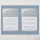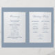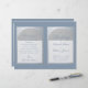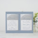 Um elegante programa de casamento dobrado com folha de prata falsa e azul empoeirado, uma cor muito moderna. Na frente, há arcos brancos em prata falsa contendo o texto, no verso, o texto está em retângulos brancos com bordas prateadas. O fundo é azul empoeirado, assim como o texto. Os títulos e os nomes da noiva e do noivo são escritos em uma elegante fonte caligráfica, o restante em letras maiúsculas. Para a festa de casamento no verso, a equipe da noiva e a equipe do noivo estão em colunas separadas.