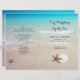 Programa de cerimônias de casamento de praia tropical. Água turquesa oceânica e areia lisa da praia são o fundo deste programa personalizado que será dobrado ao meio. A fonte casual em cinzas escuras é fácil de personalizar em quatro "páginas". Dólares de areia e condecoração de estrelas para representar o casal.