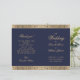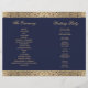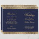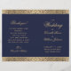 Um elegante programa de casamento dobrado com ar vintage, tendo em ambos os lados duas elegantes rosas de ouro vintage nas bordas (para cima e para baixo). Os títulos e os nomes da noiva e do noivo são escritos em uma escrita elegante e caligráfica, o restante em bonés. O fundo é marinho azul, o texto é ouro, parecido com as decorações douradas nas bordas. As decorações de rosas de ouro são de um cobrir de livros antigos, de 1912, de As Obras Políticas Completas de Geoffrey Chaucer, agora no dominio público.