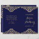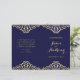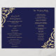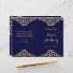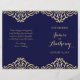 Este elegante programa de casamentos vintage apresenta um delicado embelezamento damasco de ouro sobre um fundo azul marinho. Perfeito para um glam vintage ou um casamento com o tema da arte. Este tamanho deve ser dobrado ao meio como um livreto. O papel não vem com perfuração.