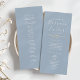 Elegante programa de casamento minimalista em azul empoeirado com coração de corda dourada romântica e caligrafia delicada. Inclui cronograma da cerimônia e detalhes da comitiva nupcial. Uma combinação perfeita para o Conjunto de Casamento Azul Empoeirado completo. Para edições ou perguntas, entre em contato: bpkolman@gmail.com