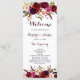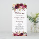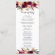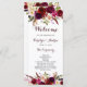 Cartão de Programa de Casamento em estilo Boêmio com ilustração em aquarela de peônias e rosas vermelhas e rosa, com sotaque de penas. É perfeito para convite de casamento de outono e inverno. Itens correspondentes também estão disponíveis.