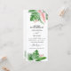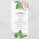 Folhas de Palma Verde Tropicais e Flores Rosa Esmagadas Aquarela com Cartões de Forma Geométrica de Folha de Ouro Faux Rosa ou Cartões do Programa de Casamento de Verão - inclui uma bela e elegante tipografia da escrita com flores botânicas tropicais modernas e verde para a celebração especial do Dia do Casamento.