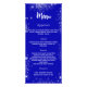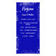 Programa de recepção de casamento e menu. Personalize e adicione seu nome, seu programa e o menu. Fundo azul real, texto branco. Decorado com falso brilho prateado, faíscas. Voltar: adicione o menu de jantar de celebração.