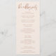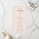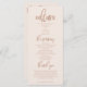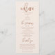 Programa moderno de casamento minimalista com fonte boho script. Fundo cor-de-rosa embebido com textos coloridos em terracota. Todas as informações da cerimônia de casamento e o nome da festa de casamento listados neste programa.