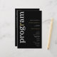 Programa de Casamento Negro de Texto Dourado Branco Na moda. Um preço orçamentário de 5,5" x 8,5", em uma elegante estoque LINEN de 110 lb - para uma sensação de luxo pelo valor do excelente, isso é perfeito para menus, além de convites e programas, etc. Este alternativo de tamanho de orçamento também está disponível em outras opções de papel. O estoque do cartão SEMI-GLOSS de 110 lb tem aproximadamente a mesma espessura do cartão postal, portanto também funciona bem para convites. O papel FELT de 100 lbs é colorido por buff, NÃO branco, então adiciona um toque rústico. O estoque de papel MATTE de 80 lbs é branco brilhante, para impressão nítida, excelente para seus menus e programas, enquanto o papel SATIN de 80 lbs é fino e leve Um design tipográfico moderno com o Programa em grande tipografia em branco com o "r" em ouro, girado e à esquerda em um fundo de preto.