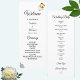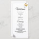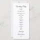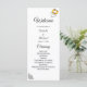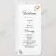 Anéis de ouro elegantes no Cartão do Programa de Casamento Romântico a preto e branco. O coração debaixo dos anéis sugere um compromisso religioso e amoroso. Ideal para casais que acreditam no amor eterno. A flor do crisântemo significa realeza.
