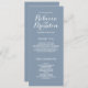 Lindos Programas de Casamento de Tipografia que você pode personalizar. Fundo azul empoeirado com texto branco. Design por Elke Clarke © Disponível em www.zazzle.com/monogramgallery. Adicione todas as suas informações pessoais para criar um programa simples, mas sofisticado, que os seus contínuos podem distribuir à medida que os seus convidados entram na igreja ou estão sentados onde a cerimônia vai ter lugar. Ajuda as pessoas a seguirem-se durante a cerimônia, mas também atua como guardiã dos seus hóspedes. Você pode usar os campos modelo para preencher as informações sugeridas sobre a festa de casamento e a ordem do serviço e o obrigado que você envia ou selecionar "personalizar" e usar o menu editar para alterar o espaçamento de texto, as fontes, as cores conforme desejar criar seus próprios programas de casamento.