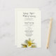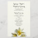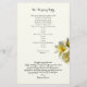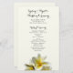 Programa de casamento plano com flores de plumeria amarelas. Papel amarelo pálido com modelos de texto em ambos os lados para uma cerimônia de casamento tradicional. Na frente, inclua um título, data, nome do local e ordem da cerimônia. No verso, listem a festa de casamento, oficial, pais e avós, e incluam um parágrafo de obrigados. Também se podem referir aqueles que se amaram e que passaram. Este artigo vem com atualizações.