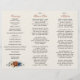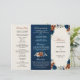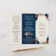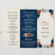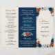 Elegante programa de casamento tri dobrável com tema floral terroso laranja, azul naval, apresentando um buquê elegante de rosas azul naval, peônias cor de terracota e folhas de eucalipto verde. Por favor, entre em contato comigo para qualquer ajuda na personalização ou se você precisar de qualquer outro produto com este design.