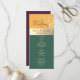 Elegante, moderno, tons de joia, programa de casamento verde esmeralda, amarelo e roxo ameixa, com renda floral dourada e caligrafia simples.