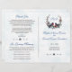Chic Berries Bullfinch Winter Wreath Wedding Program Romântico Carteira com design de inverno (ramos de abeto, frutos vermelhos e folhagem) com dois pássaros (bulfinch), que abre espaço para as iniciais da noiva e do noivo, tudo sobre fundo branco com flocos de neve esmaecidos. Use a ferramenta Personalizar para adicionar suas informações. Veja, também, minha coleção de celebrações de eventos da vida de inverno.