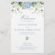 Projetado para combinar com nossa coleção de casamento com Monograma de Hortênsias Azuis Desbotadas Elegantes, este programa de cerimônia personalizável apresenta hortênsias azuis e brancas elegantes em aquarela com uma fonte de caligrafia elegante e fonte serifada clássica. Itens correspondentes disponíveis.