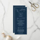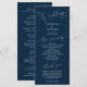 Programa de casamento mínimo com fontes modernas em um fundo azul marinho. Todas as informações da cerimônia de casamento e o nome da festa de casamento listados neste programa.