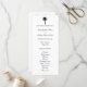 Elegante programa de cerimônias de casamento de praia em preto e branco com silhueta de palmeiras de chic. Modelo de vazio com tipografia de na moda. Parte do conjunto de coleta de temas costeiros que combinam. Trendy inspirational stationery design para noiva de classe e noivo se casando. Inclui nomes personalizados, data, local, ordem do serviço de cerimônia e festa de casamento. Acessórios e suprimentos para casamentos bonito para planejar seu casamento, chá de panela, noivado e muito mais. Tropical costeira e destino exótico do tema do casamento. Estilo luxuoso.