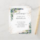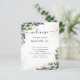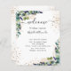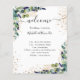 Fundo branco elegante, decorado com folhagem de eucalipto, folhagem dourada e pó de glitter dourado falso. Personalize e adicione seus nomes e o cronograma do seu dia de casamento.