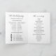 Nosso Programa de Cronograma da Cerimônia de Casamento com Foto Elegante é um design lindo, criado para guiar seus convidados durante o seu dia de casamento enquanto captura o coração da sua história de amor. Curado com carinho e refinado visualmente, este programa é mais do que um itinerário, é um memento precioso que os seus convidados irão guardar por anos. Com espaço para uma foto de noivado ou casamento favorita, o programa descreve graciosamente o cronograma da cerimônia, apresenta a festa de casamento e inclui uma seção comovente "Em Memória Amorosa" para homenagear aqueles que estão presentes em espírito. Uma área dedicada convida os convidados para a sua recepção, com detalhes de horário e endereço, enquanto uma mensagem calorosa de agradecimento expressa a sua gratidão por compartilhar o seu dia especial. Perfeito para casais que valorizam o design atemporal, detalhes significativos e primeiras impressões inesquecíveis.