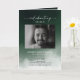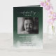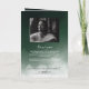 Programa memorial funerário com uma fotografia do falecido, seu nome, datas, local memorial, data do evento, e uma elegante tela verde de nevoeiro. Na dentro está um obituário, e a ordem de serviço; e atrás de outra foto, uma nota de agradecimento e o segundo lugar para depois do funeral. Para mais personalização, clique no link "Editar usando a Ferramenta de Design" e use nossa ferramenta design para modificar esse modelo. Se precisar de ajuda ou itens correspondentes, entre em contato comigo.