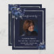 Um programa elegante de 2 páginas. Um fundo azul escuro, uma moldura prateada falsa, flores azuis e espaço para uma foto. Personalize e adicione nome, datas e seu texto.