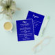 Note que este menu/programa está em papel folheto e muito fino. Para menu/programas mais espessos (mesmo design) visite nossa loja. Um fundo azul real. Texto branco. Frente: personalize e adicione seu nome, data e menu. Voltar: Programa. Se você tiver um grande programa, poderá reduzir o espaçamento entre linhas.