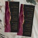A borda esquerda deste elegante programa de casamento moderno apresenta uma cor-d-água vermelha borrifada, aparada com falsa brilho dourado. O texto personalizável combina o script de caligrafia dourada e sans serif fonts em um fundo escuro.