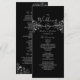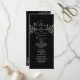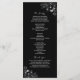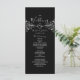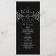Programa de casamento preto e branco, elegante e moderno, com coração de corda prateada e renda floral vintage dourada.
