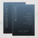 This elegant wedding program features a minimalist design with a vertical layout, divided by a thin white line creating a stylish margin. The gradient blue background transitions from light to dark, enhancing the modern and sophisticated aesthetic. A bold serif font spells out "WELCOME" vertically on the left, while the right side lists ceremony events in clean sans-serif text, ensuring clarity and readability. The overall mood is formal and inviting, perfect for a ceremonial occasion, with customizable elements allowing personalization for any event date.