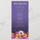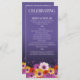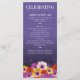 Adicione um pouco de elegância ao seu casamento com este programa de temática floral, que apresenta o serviço de casamento e a festa de casamento em elegantes letras brancas com confete roxo lavanda e margaridas africanas coloridas em um fundo roxo violeta a preto. Personalize com os nomes da noiva e do noivo, local do local, data de recepção, detalhes de serviço e festa de casamento. Design © W.H. Sim. Mais informações em zazzle.com/expressionsoccasions