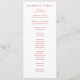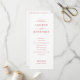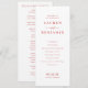 This wedding program features a minimalist and elegant design with a soft pink background and muted coral red text, creating a harmonious contrast. The layout is clean and structured, utilizing classic serif typography to convey sophistication and formality. Perfect for weddings, it includes customizable sections for the ceremony details, ensuring clarity and readability while maintaining a refined aesthetic. The overall mood is one of understated elegance, making it ideal for couples seeking a timeless and stylish invitation.