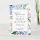 Este elegante programa de casamento dobrado branco de hydrangea azul é perfeito para um casamento de primavera ou verão. O clássico design floral apresenta faixas de cor azul-d-água de pó macio, acentuadas com flores cor-de-rosa e folhas verdes, cor-de-rosa e borrado neutro.