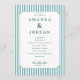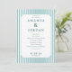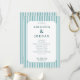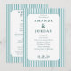 Este programa de casamento apresenta um design moderno e minimalista com um layout vertical emoldurado por listras alternadas de azul claro e branco. A paleta de cores inclui tons de azul-teal suave e azul-marinho suave, criando um visual elegante e sofisticado. A tipografia é limpa e clássica, usando fontes serifadas para destacar os detalhes da cerimônia em um formato estruturado. Perfeito para casais que buscam uma estética atemporal e formal, este programa combina clareza com um toque de refinamento, tornando-o ideal para qualquer celebração de casamento.