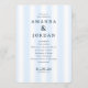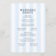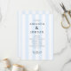 Este programa de casamento apresenta um design moderno e minimalista com um fundo azul claro adornado por listras verticais brancas. O texto azul-marinho elegante é organizado de forma clara, destacando os detalhes da cerimônia e os nomes de forma proeminente. Com linhas limpas e amplo espaço negativo, este design exala sofisticação e tranquilidade, perfeito para uma celebração de casamento formal. Seu layout direto garante legibilidade, mantendo um clima convidativo e sereno.