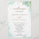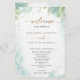 Programa Elegante de Casamento com delicado fundo de manchas de aquarela e verde superior em turquesa, aqua, azul empoeirado e matizes verdes macios. Dourados detalhes nas folhas, manchas e caligrafia moderna escrita à mão. Capacidade de fazer alterações e ajustes de texto selecionando personalizar ainda mais. Frente com detalhes da cerimônia de casamento, volte com nomes de festa de casamento e obrigado que envie para seus convidados. Sentimento moderno elegante. Também disponível sem detalhes verdes, mas mantendo manchas de aquarela sobre o fundo. Parte da nossa coleção "Airy Blue and Green Watercolor" com vários produtos de coordenação disponíveis.