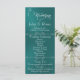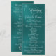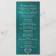 Este design romântico apresenta um elegante fundo azul-verde com os detalhes da cerimônia de casamento e agradecimentos na frente, os membros da festa de casamento e o monograma de coração no verso. Disponível em várias cores para combinar com o tema do seu casamento. Projetado para combinar com a Coleção de Casamento "Romantic Scroll Hearts & Calligraphy".