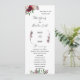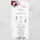 Cartão do programa de casamento com burgundy & greenery floral, pequenos rabiscos e nomes de caligrafia.