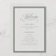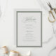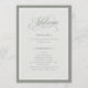 Estes programas elegantes e simples de boas-vindas ao casamento branco apresentam uma fronteira verde sage e um design verde e branco mais leve. Há uma mistura de texto clássico e caligrafia moderna para um design clássico e minimalista perfeito para seu eterno, casamento formal.