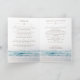 Um programa de funeral dobrado com uma fotografia tranquila de ondas contra uma praia. No cobrir, uma foto do seu amado junto com o nome e os anos de vida deles. Dentro você pode escrever o obituário e o programa. No verso você pode adicionar reconhecimentos.