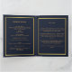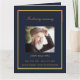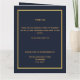 Um elegante programa de 4 páginas. Um fundo azul escuro, uma falso estrutura dourada e espaço para a sua foto na frente. Personalize e adicione nome, datas e texto.