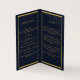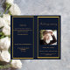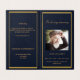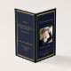 Um elegante programa de 4 páginas. Um fundo azul escuro, uma falso estrutura dourada e espaço para sua foto. Personalize e adicione nome, datas e texto.