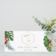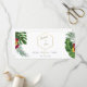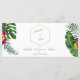 Gráfico de Casamento com design tropical, folhas de palma verde, flores amarelas e vermelhas e geometria dourada.
