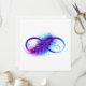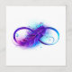 Símbolo infinito com uma bela pena pintada em cores roxas e azuis brilhantes sobre fundo branco.