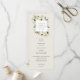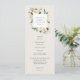 A nossa coleção de casamentos florais de coloração d'água de Ivory Bloom apresenta um quadro de cor d'água delicadamente pintado, folhas de eucalipto, folhagem botânica verde e flores de pénia branca e marfim. Personalize a frente e o verso destes programas de casamento com os detalhes da sua cerimônia e a sua festa de casamento.