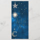 Você está pronto para elevar seu cardápio de casamento a outro nível? Imaginem um céu noturno celeste, completo com estrelas astrais e uma lua crescente brilhante contra um pano de fundo azul escuro e azul claro. Nosso tema moderno é a escolha perfeita para um casamento à na moda. E a melhor parte? Nosso design é completamente personalizável, para que você possa facilmente adicionar seu próprio toque pessoal. Diga olá para um design de cardápio de um tipo.