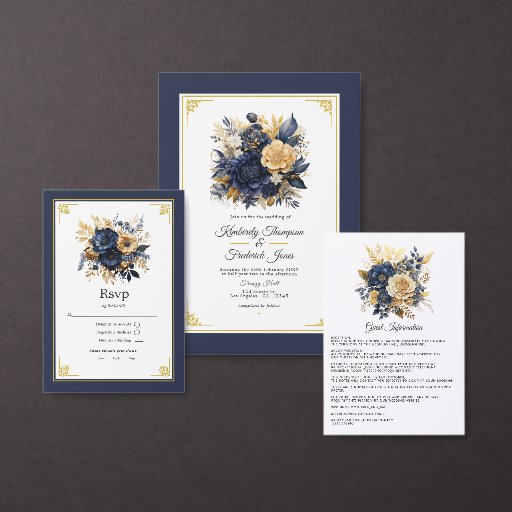 Programa de casamento floral de marinho azul e ouro personalizável para suas especificações de evento.