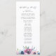 Elegante programa de casamento floral com seus nomes cercados por uma coroa de flores roxas, maduras e azuis com folhas verdes. Personalize os programas de casamento florais adicionando a data e o local do casamento, a ordem dos eventos e a festa de casamento no verso. Projetado para coordenar com nossa coleção de casamento Midnight Blooms.