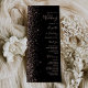 A borda esquerda deste elegante programa de casamento moderno apresenta um rosa dourado faux glitter design. O texto personalizável combina letra rosa pálida, letra copperplate e letra itálico num fundo preto.