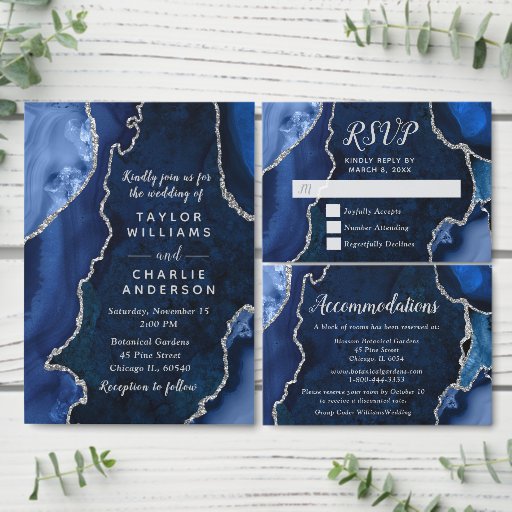 Guide your guests through your ceremony with this elegant wedding program featuring a navy blue agate marble design accented with silver details. The geode-inspired background creates a sophisticated look, perfect for fall and winter weddings, formal celebrations, or evening events. Designed to coordinate with your wedding stationery suite, this program is ideal for outlining your order of service, wedding party, and special moments of your day in a clear and stylish format. The clean typography ensures readability while complementing the agate texture. Easily personalize all text to suit your ceremony details and create a seamless, polished experience for your guests.