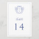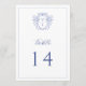Regência Blue Monograma Crest, número da mesa de casamento. Vintage inspirou o estilo barroco Crest. Recursos, elegante e elegante design de tipografia azul, combinação de script e tipo negrito. Observe que os cartões de número de tabela devem ser solicitados individualmente.