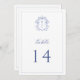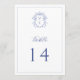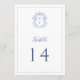 Regência Blue Monograma Crest, número da mesa de casamento. Vintage inspirou o estilo barroco Crest. Recursos, elegante e elegante design de tipografia azul, combinação de script e tipo negrito. Observe que os cartões de número de tabela devem ser solicitados individualmente.