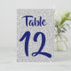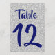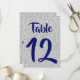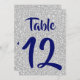 Um elegante cartão de mesa de casamento monograma com números azuis reais em um efeito de fundo brilhante prateado. O estilo, cor e posicionamento da fonte também podem ser alterados de qualquer maneira.